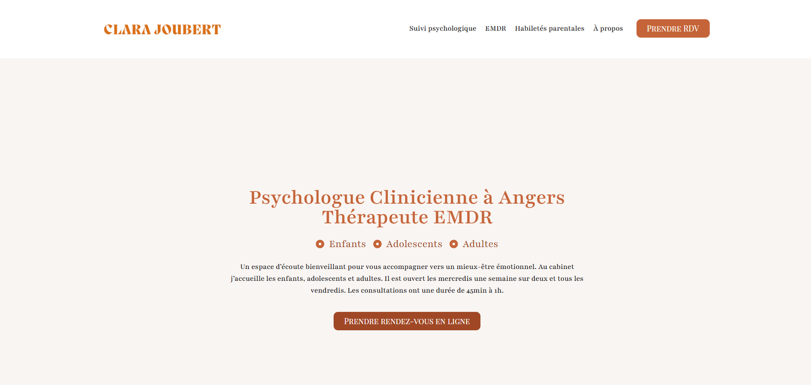 Ouvrir un cabinet libéral est une étape cruciale, mais sans visibilité locale, l’agenda reste vide. Pour le lancement de l’activité de Clara Joubert à Angers, nous avons conçu un site vitrine orienté conversion. De la mise en valeur de son approche thérapeutique à l’intégration fluide de son outil de réservation, découvrez comment nous avons bâti son premier levier d’acquisition de patientèle.